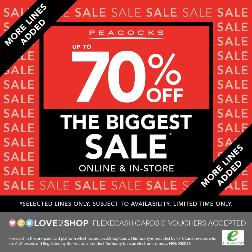 The biggest sale, just got bigger at Peacocks with new lines added. shop now for up to 70% off selected lines.*Limited time. Subject to availability. Selected lines only.... more ››