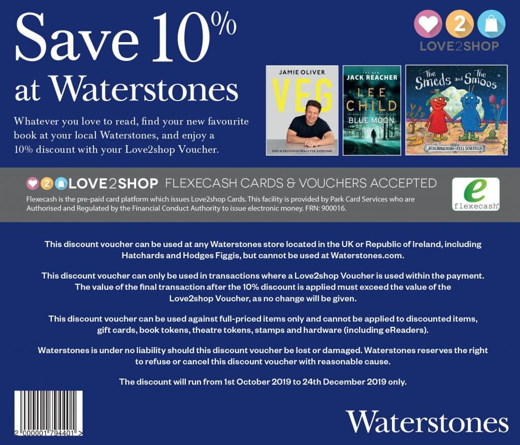 Save 10% when you you use your Love2shop Voucher(s) to buy your new favourite book at Waterstones.This discount voucher can be used at any Waterstones store located in the UK or Republic of Irel... more ››
