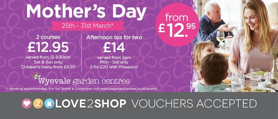 Why not treat the special women in your life to lunch or afternoon tea at Wyevale Garden Centres. Get 2 courses for only £12.95 or afternoon tea for £14.00. Booking is recommended.... more ››